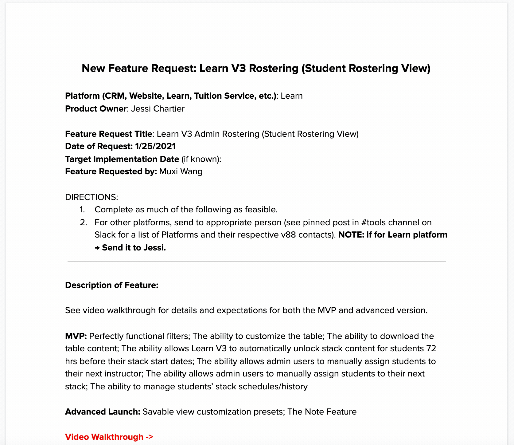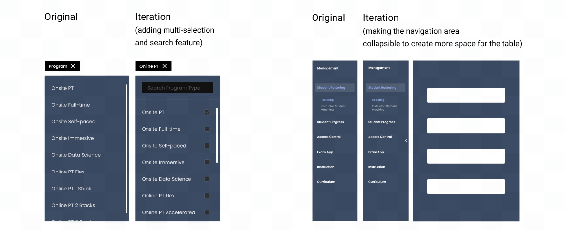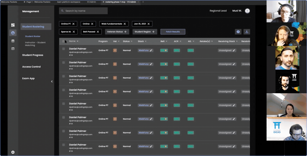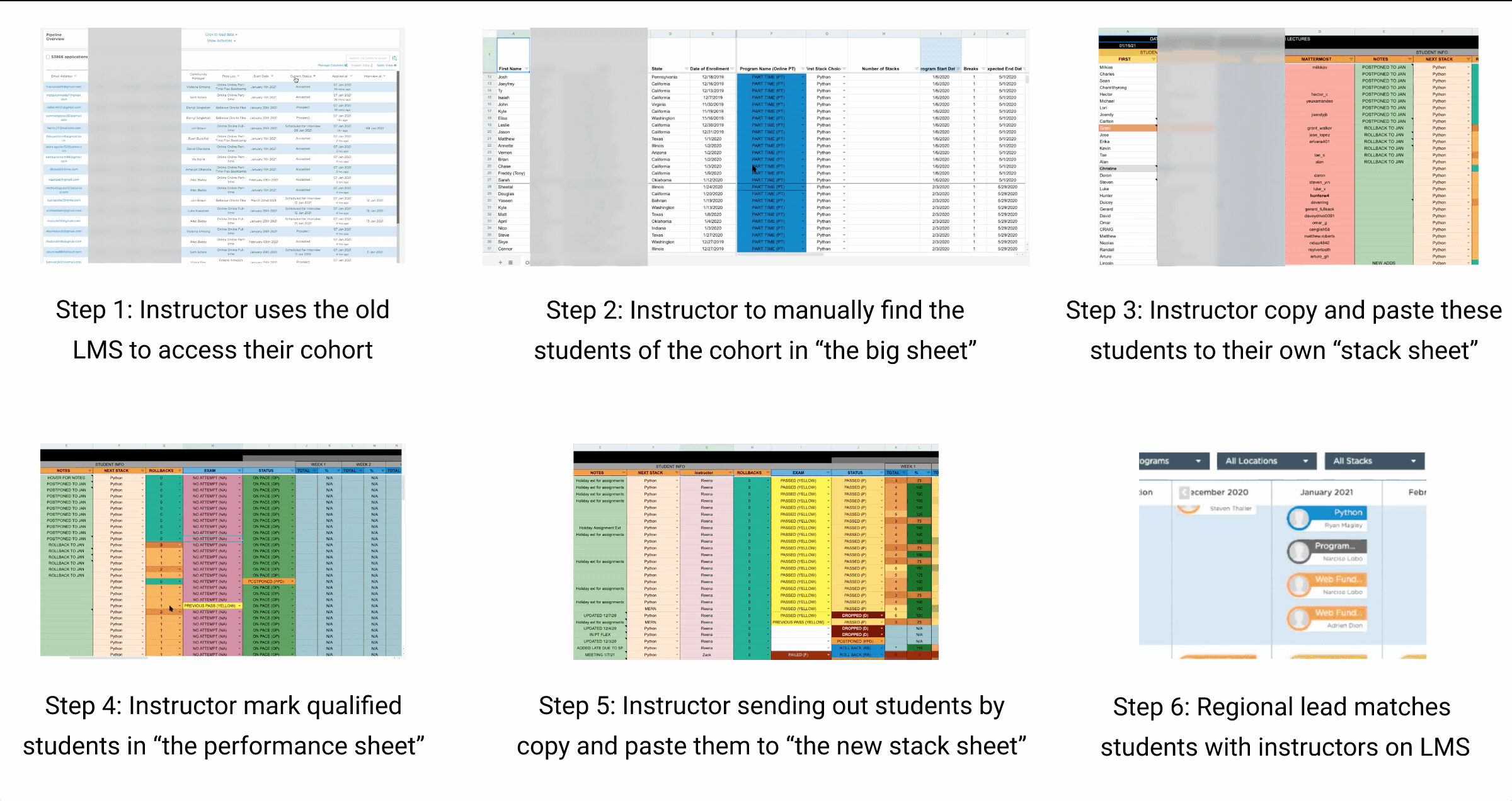 Coding Dojo’s instructors used to rely on spreadsheets + other tools (e.g. the old LMS) to roster students. This used to work when the company was a local-facing, smaller-size bootcamp service based in Seattle. With its rapid expansion in the past few years, Coding Dojo now has services to not only most of the states but also a few dozens of countries on different continents. The lack of efficiency and standardization in the traditional rostering tools has become frustrating to instructors, as they now have to manage much more students.