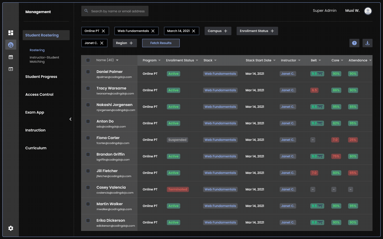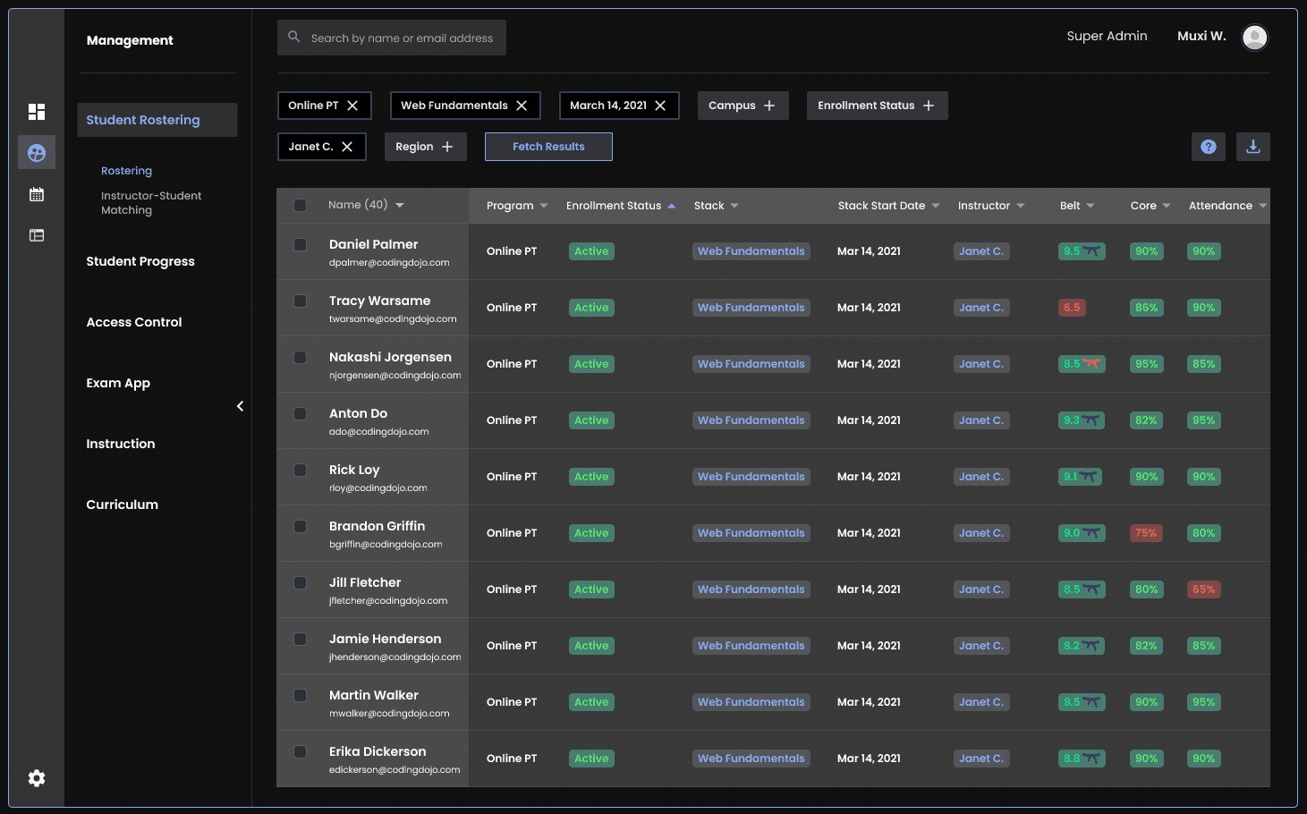 Coding Dojo has been rapidly growing. As a result, many of the company’s traditional workflows have become growing pains. Rostering is a crucial and complex process of student management. Due to the lack of a suitable internal tool, instructors have been relying on multiple external tools like spreadsheets to roster their students. The lack of consistency, standardization, and automation has brought not only confusion and frustration to users, but also business risks to the company.