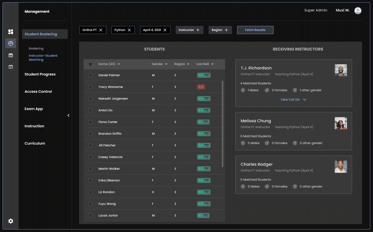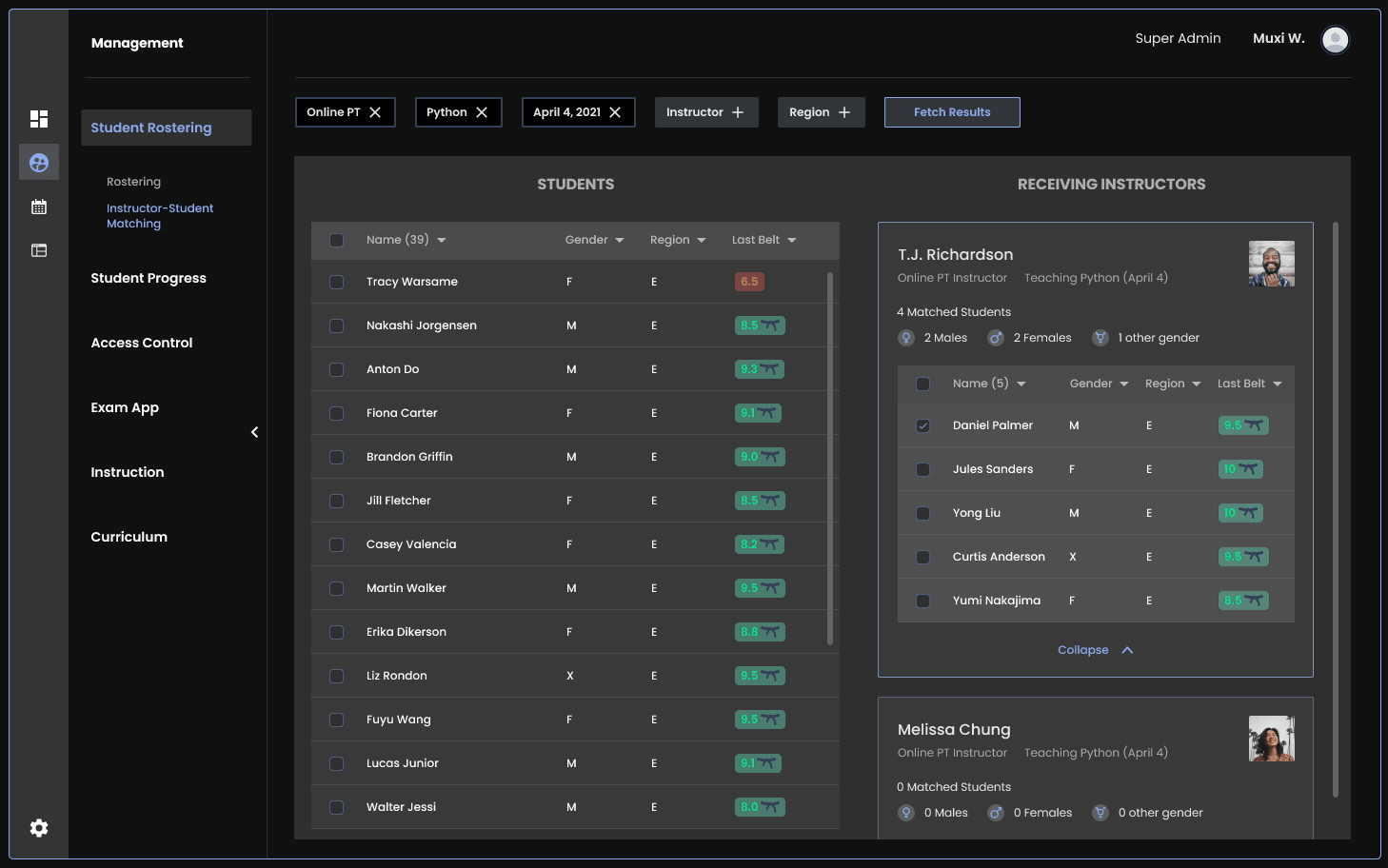 Step4(option B): Regional lead select multiple/all students, and use the Smart Match feature(system to evenly break students up into diverse cohorts based on their demographic information) to auto-match students with their next instructor - Job done for regional lead, hooray!